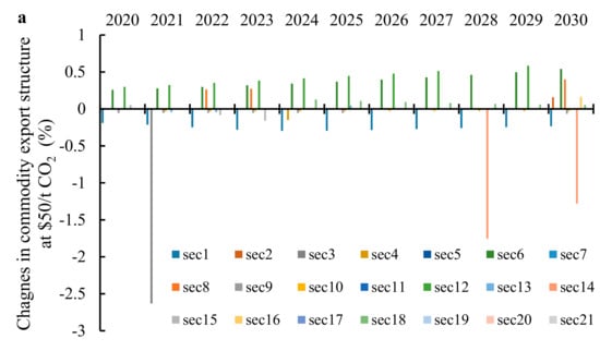 Commodity export structure is the proportion of different commodity exports among the total exports. For example, if we set the carbon tariff at $50 (Figure 2a) we find a downward trend in the proportion of exports from coal mining and selection; machinery and equipment manufacturing; and communications. The main reason is that these sectors are energy intensive. A carbon tariff has a greater impact on primary industries because of higher elasticity of demand and a high proportion exported to the USA. When raising the rate from $40 to $60, a carbon tariff will have a more evident impact on China’s commodity export structure involving more sectors, including the textile and products industry; wood-processing, paper, and printing industry; and transportation, storage, and post. A carbon tariff is expected to change China’s commodity export structure and the degree of influence is positively correlated with the rate.