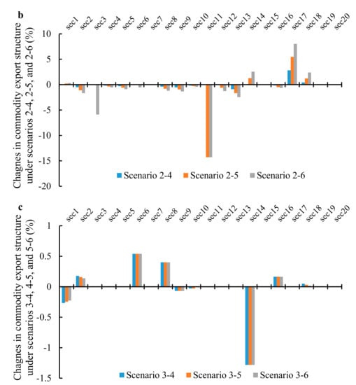 The proportions of most commodity exports decline in all tax policy combination scenarios. Compared with the single carbon tariffs, taking Scenarios 2-4, 2-5, and 2-6 as examples (Figure 2b), tax policy combination is more effective in influencing exports. For example, a carbon tax reduces the adverse effect of carbon tariffs on the mining industry, chemical industry and metal smelting industry. A carbon tax increases domestic commodity production costs, especially for energy intensive goods, causing a reduction in production and export. Furthermore, when the carbon tax rate is $5 or $10, raising the carbon tariff rate will decrease some exports; but, when the rate is $15, raising carbon tariffs will not influence on China’s commodity export structure. However, in Scenarios 2-4, 2-5, and 2-6, it can be found that the higher of the carbon tax rate, the more obvious changes in China’s commodity export structure. In general, a carbon tax reduces the impact of carbon tariffs on China’s export structure.