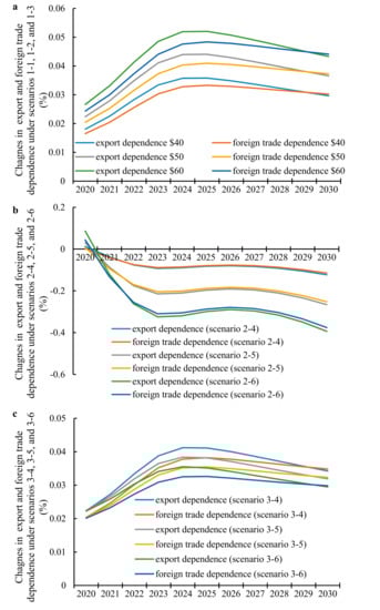 Foreign trade dependence is the proportion of export and import values relative to GDP. Export dependence is the proportion of export value relative to GDP. As shown in Figure 3a–c, the trends in foreign trade dependence are similar for the single carbon tariffs and subsidy policy combination. However, subsidy policy combination has a lower effect on foreign trade dependence and export dependence than the single carbon tariffs because an export subsidy reduces the impact of carbon tariffs and compensates for the trade loss caused by carbon tariffs.