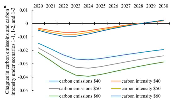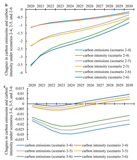 As shown in Figure 4a–c, all simulations result in lower carbon emissions, but there are big differences in the degree of change. Additionally, the initial change of carbon intensity is negative, but there is a positive change in later periods, as is the case for all schemes.
