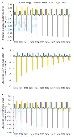 The decrease in carbon emissions for each scenario attributes to the improvement of energy structure. As shown in Figure 5a, the proportion of coal utilization decreases during 2020 to 2030. A carbon tariff influences China’s energy structure and impacts fossil fuels to a greater degree, particularly as the tax rate increases.