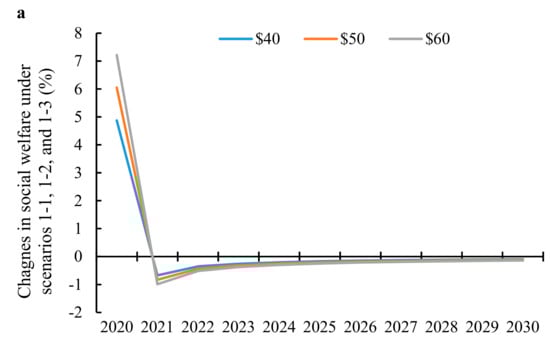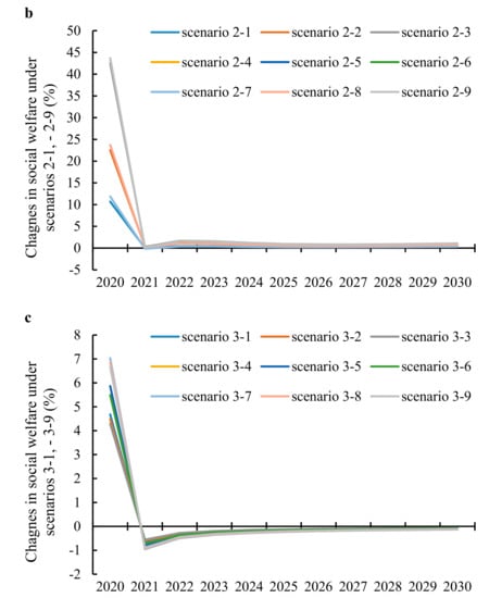 As shown in Figure 6a–c, the changes in these three kinds of simulation schemes have a similar impact on welfare. A carbon tariff reduces commodity consumption and decreases welfare level dramatically. However, in the long-term, the adverse effect of a carbon tariff will slow down over time and recover. This is because Chinese enterprises will optimize their production by adjusting the structure of energy consumption, improve production efficiency, and price changes stabilize. In terms of impacts on China’s energy prices, the domestic carbon tax is most obvious, so the changes in social welfare in the early stage will be greatest. Implementing an export subsidy policy in the short term will reduce the adverse impact of a carbon tariff on social welfare, but in the long-term the policy has little effect. Generally, subsidy policy combination is superior to single carbon tariffs policy, but inferior to the tax policy.