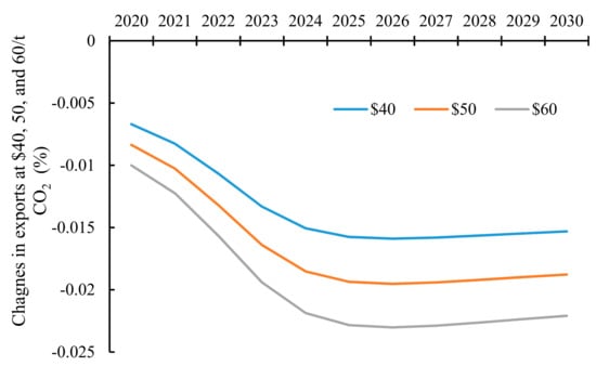 The impact of $50 carbon tariffs levied by the USA on China’s regional export structure can be found in the Table A1 in Appendix A. For example, the proportion of exports from the oil and nuclear fuel processing industry to the USA drops by 32% in 2020, declining to 15% in 2030. Trade diversion is not evident in non-export-oriented sectors. Exports to JAP, EU, and ROW are unchanged due to weaker elasticity of demand for such goods in JAP, EU, and ROW. The global demand for goods, such as from coal mining and selection and the oil exploitation industry, is more inelastic. Overall, the net impact of a carbon tariff is to reduce China’s trade balance. When the carbon tariff rate increases from $40 to $60, the influence on China’s regional export structure is more obvious.