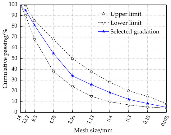 The gradation of AC-13 (which is usually used in the upper layers of highways), as illustrated in Figure 1, was selected for the asphalt mixtures in this study. For the mix design, the orthogonal experimental design and the Marshall design were combined to study the diatomite and basalt fiber composite modified asphalt mixtures. The diatomite content, basalt fiber content, and asphalt-aggregate ratio were chosen as the orthogonal factors. The L9 orthogonal table was used to design the three-factor experiment, and the mix design of composite modified asphalt mixtures is shown in Table 6. The mentioned AC specimens with diatomite and basalt fiber were prepared by the Marshall compaction method. The detailed procedures have been illustrated in previous studies [16,30].