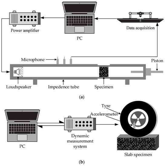 Effective methods for characterizing the sound absorption property of materials mainly include the reverberation chamber method and the impedance tube method, and the reverberation chamber method is relatively expensive. The impedance tube method has low requirements for specimens and is precise and convenient while measuring the sound absorption properties of specimens [28]. The measurement system using the impedance tube method is shown in Figure 2a; it consists of a power amplifier, loudspeaker, impedance tube, microphone, and data acquisition system. The specimen was firstly placed on one side of impedance tube, and the loudspeaker was placed on the other side to produce an acoustic wave. Then, the sound absorption properties of materials could be measured through the standing wave ratio, which could be calculated by Equations (1–4).