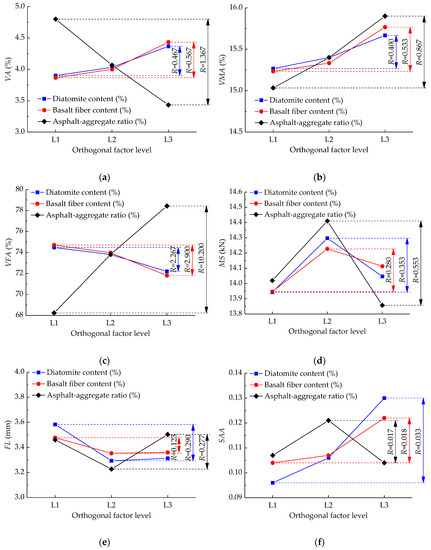 According to Figure 3a, with different levels of the orthogonal factors, the VA values of diatomite and basalt fiber composite modified asphalt mixtures met the standard of 3.0–5.0%. The influence order of three orthogonal factors on VA was asphalt-aggregate ratio > basalt fiber content > diatomite content. The increase of asphalt content would fill the voids in the asphalt mixture, leading to a decrease in the VA. Due to the adsorption of asphalt by diatomite and basalt fibers, the increase of diatomite and basalt fiber content would absorb more asphalt, reduce free asphalt, and then increase the VA. At the same time, the spatial network structure made by basalt fibers would enhance the asphalt mixture, resulting in difficulties in compacting asphalt mixtures. Therefore, the addition of basalt fibers would also increase the VA gradually.
