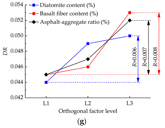It can be seen from Figure 3g that the influence order of three orthogonal factors on DR is basalt fiber content > asphalt-aggregate ratio > diatomite content. The increase of diatomite, basalt fibers, and asphalt would increase the damping ratio of the asphalt mixture. The addition of basalt fiber had the best effect on the vibration reduction. The special network structure by basalt fibers will strength and enhance asphalt mixtures, leading to a better vibration reduction performance.