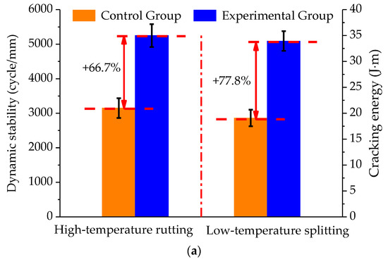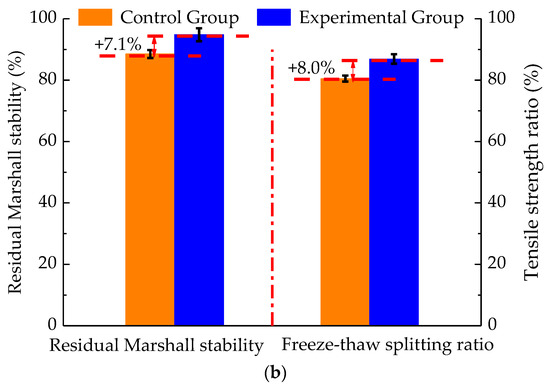The conventional pavement performances of asphalt mixtures: (a) high and low temperature test; (b) moisture stability test.