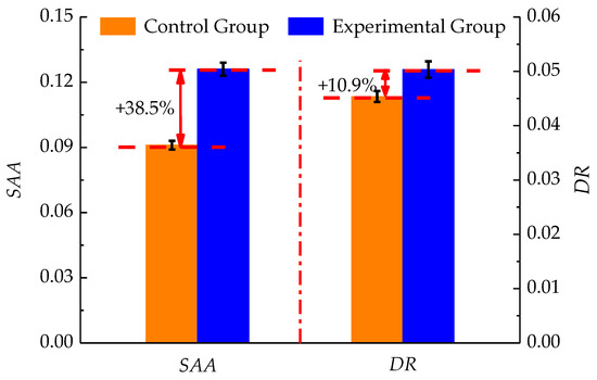 With regard to sound and vibration absorption performances of asphalt mixtures, SAA and DR were chosen to characterize the sustainable performances, and the comparison results are illustrated in Figure 5. From Figure 5, the addition of diatomite and basalt fiber composite modifier could significantly improve the sound absorption performance of the asphalt mixture by about 38.5%. At the same time, the vibration reduction of the diatomite and basalt fiber composite modified asphalt mixture also improved, and the DR improved by 10.9% compared with the base asphalt mixture, which means the modified asphalt pavement had a more comfortable performance. Moreover, crumb rubber was proven to improve the acoustic performances of asphalt pavement [39,40].