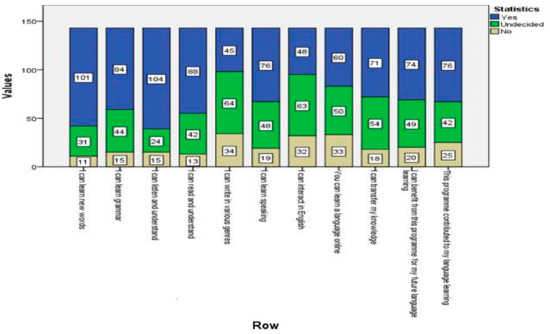 As the third inquiry, the study questioned the probable contribution of the program to students’ 21st-century skills and lifelong language learning propensities as they perceived. In the following Figure 3, we see the students’ views regarding the contribution of the program to these issues.