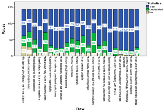 On the other side of the coin, we understand that the students believe that they are informed about lifelong learning (102 students), know how to learn (89 students), conduct research (96 students), and are able to prepare projects without help (81 students). The participants display confidence in themselves in intra and interpersonal qualities as well as technology and metacognitive skills. For instance, they say that they are able to communicate with others easily (110 students), they are aware of the ways to interact with people from other cultures (72 students), they can evaluate themselves objectively (111 students), and are informed about ways to improve themselves (97 students).