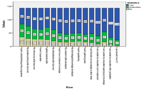 Concerning the sustainability of their learning, we come up with similar results and see that students believe that they can sustain their learning out of the classroom (105 students), sustain their language education (89 students), even after graduation (111 students), and finally, they can benefit from interaction and communication technologies (119 students). Thus, we may briefly say that from the students’ perspective, the program contributed to the students 21st-century skills and lifelong language learning propensities. The only negative outcome revealed was related to critical thinking skills. The students stated that the program did not add to their critical thinking skills.