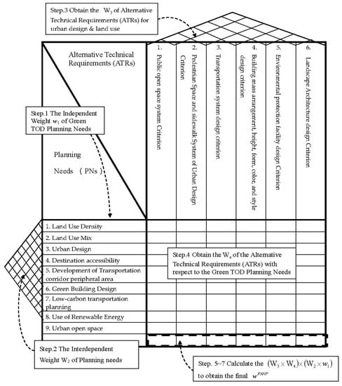 Through the calculation of HOQ matrices to combine the Green TOD planning needs with the technical requirement criteria of current urban design and land-use control, the results show the impact of both planning need preference and expert perception (on the importance degree of design technical requirements) on the technical requirement weight of the built environment planning and design under the Green TOD.