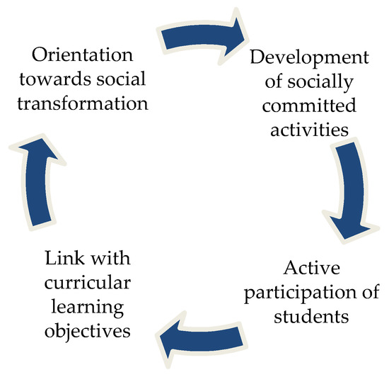 SL is an innovative teaching methodology that is generating great interest among educators from a range of levels and academic disciplines. According to Ngai et al. [6], it is an educational proposal that combines learning and community service in a single project based on the implementation of skills related to curriculum contents carried out in real contexts, where the main aim is improving students’ critical capacity while offering a social benefit. This definition, as shown in Figure 1, includes four essential characteristics for a teaching activity to be considered SL: (a) the key role played by students in the processes of academic learning and social participation; (b) connection between the community service activities and curricular learning goals; (c) orientation towards social transformation; and (d) interaction with society through socially committed activities.