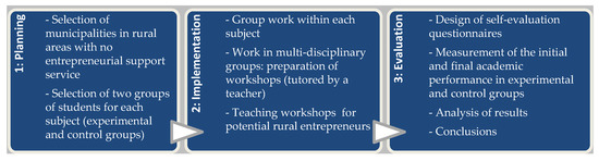 - In the first stage of planning, the service to be provided to society and the context of the activity were determined. For this purpose, we first contacted various town councils in the province of León (Spain), all of them in rural municipalities with no entrepreneurial support service. Subsequently, once the number of local public institutions willing to collaborate in the SL project and the number of workshops agreed with them were known, both the experimental group and the control group were selected.