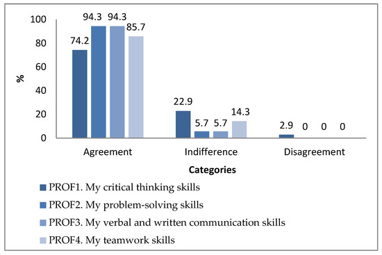 These findings are in line with those shown in Figure 3, Figure 4 and Figure 5, which represent the proportion of students that chose the different response options for each of the four items measuring the three key dimensions for self-assessment of SL by students, respectively. For the sake of clarity, the five initial response categories (from 1 “totally disagree” to 5 “totally agree”) were collapsed into three categories: agreement, indifference, and disagreement.