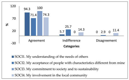 As the table shows, service-students acknowledged that their participation in the SL experience for Sustainability Entrepreneurship especially improved their civic and social responsibility (dimension’s mean score = 4.36), followed by their professional skills (dimension’s mean score = 4.25) and, to a lesser extent, their curricular development (dimension’s mean score = 4.11). Of the 12 aspects that might improve after participation in SL, on average the service-students showed a greater degree of agreement with item SOCI3 (“My commitment to society and to sustainability”), while item PROF1 (“My critical thinking skills”) obtained the lowest average score.