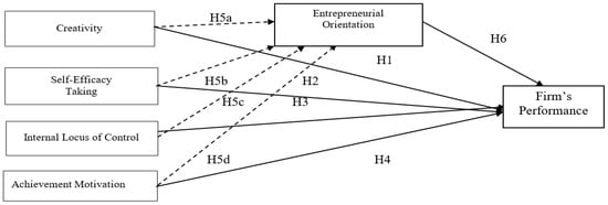 A thorough review of literature encompassing the individual constructs has highlighted the need to study these variables in a holistic manner. Although a number of studies have been carried out in the past using different entrepreneurial traits as predictors of firm performance [65], the entrepreneurial traits have also been studied to measure their effect on firm’s performance. Nevertheless, there seems to be a gap in research where all these constructs have been brought together. Notably, the research of Khedhaouria et al. [9] is important in this regard where the entrepreneurial traits of self-efficacy and creativity have been empirically tested as predictors to determine the mediating role of entrepreneurial orientation on firm performance. Their study revealed that the two traits have a significant effect on a firm’s performance when supported by a strategic decision-making process, i.e., entrepreneurial orientation. In addition, the study by Ahmed [66] suggests the traits of achievement motivation and internal locus of control should be tested in the same realm. Poon, Ainuddin, and Junit [67] and Khedhaouria et al. [9] carried out similar studies which also highlighted the significance of these two traits in order to develop a concrete understanding of the antecedents of a firm’s performance.
