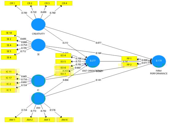 Primary methods were used for the data collection. The questionnaire used for this research was structured, adapted, and modified based on the research being conducted. The variables used in this study were adopted from past studies. The first section of the questionnaire was based on demographic information. The demographics consisted of information regarding the respondents as well as the firm. The demographics of the respondents included gender, age, and education of the entrepreneur. The age of the firm was also identified from the question, “when was the firm established?” and data was collected about the size of the firm by asking the respondents how many employees worked for the organization. The second section of the questionnaire was based on the study constructs. All the constructs were tracked on a five-point Likert scale ranging from 5 (strongly agree), 4 (agree), 3 (neutral), 2 (disagree), and 1 (strongly disagree). The construct of creativity was measured through four items which was initially developed by Tierney et al. [76] and for this study were adopted from Khedhaouria et al. [9]. A sample item to know about creativity was “I feel that I am good at generating novel ideas”. A general self-efficacy scale was used to measure the construct of self-efficacy, which had been developed by Schwarzer et al. [77]. This scale was composed of 10 items adopted from Khedhaouria et al. [9] to measure and understand self-efficacy beliefs. A few examples of the items from self-efficacy are, “I can always manage to solve difficult problems if I try hard enough” and “no matter what comes my way, I’m usually able to handle it”. The construct of internal locus of control was measured using the locus of control of behavior scale [78]. This scale consists of 16 items measuring the extent an individual perceives actions as being an outcome of an individual’s behavior. If the action is attributed to relating to personal efforts, then it is an internal control. A sample of the items is “when I make plans, I’m almost certain that I can make them work”. To measure the construct of need for achievement, a five-item instrument was adapted [7]. The scale was developed by Hermans [79], and it has also been discussed in the literature by McClelland [38], and then later in (1987). Entrepreneurial orientation was measured using the scale adapted from Khedhaouria et al. [9]. Covin and Wales [58] devised this scale on the three dimensions of entrepreneurial behavior, i.e., risk taking, innovativeness, and proactiveness. In this study, each dimension had three items to measure the behavior. To assess firm performance both subjective and objective measures can be used. More commonly, subjective measures are used because objective measures are at times difficult to interpret for new ventures as they are less susceptible to common procedure bias. Strong reliability and validity have, however, been exhibited by subjective measures Dees and Robinson [19]. In this study, two items were adapted from the literature reflecting financial performance and growth of the entrepreneurs [9]. Item one, “the financial profit of your firm is exceptionally well this year” reflects that the respondent is satisfied with the firm’s performance and the actions taken during the year have gone in favor of the organization. Item two, “the sales volume of your firm was higher than the average growth of the last three years” reflects that the market for the products and services are also doing well.