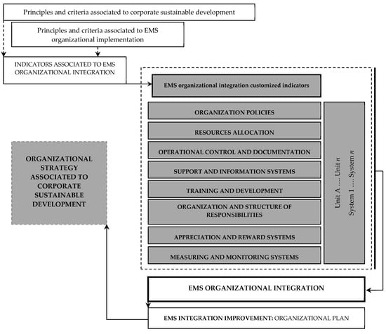 EMS integration implies organizational reutilization of various environmental practices associated to (i) planning and organization, (ii) operational, and (iii) communication. Hence the ISO 14001 EMS integration dimensions/indicators could be considered the following [5,15,28]: (i) environmental organization policies, (ii) environmental resources allocation, (iii) environmental operational control and documentation, (iv) environmental support and information systems, (v) environmental training and development, (vi) environmental organization and structure of responsibilities, (vii) environmental appreciation and reward systems, and (viii) environmental measuring and monitoring systems.