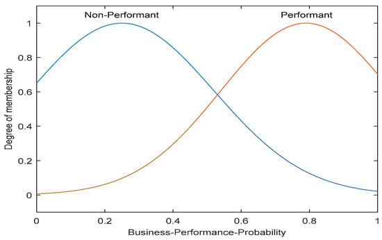 In order to determine business performance probability based on fuzzy inference system, the relations were statistically determined, based on Equation (1). Figure 3 presents the crisp output value for business performance probability indicator obtained by defuzzification of fuzzy sets included in the analysis. To build our fuzzy model we used the MATLAB fuzzy Logic Toolbox.