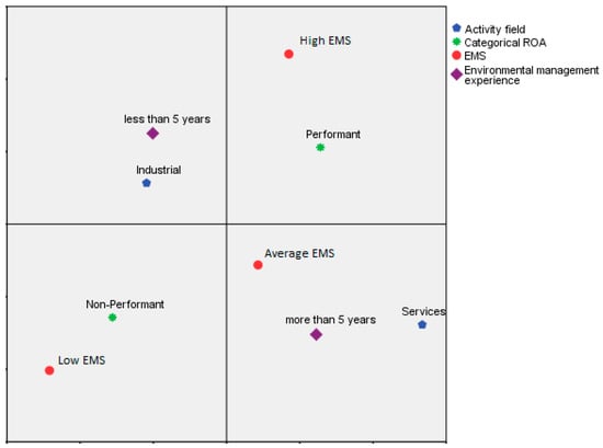 In the study, business performance was measured by using return on assets (ROA) [70,86,87,88] for which 4 categories were determined: less than 10% and between 10% and 30% for non-performant companies and between 30% and 50% and more than 50% for performant companies. ROA distributions, by categories, are presented in the following tables according to activity field, environmental management experience, and EMS implementation.