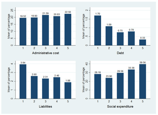 Prior to the regression analysis, we preliminarily analyzed how the dependent variables vary by the different scales of the effectiveness of participatory budgeting, as displayed in Table 4 and Figure 1. Except for administrative costs, debt, liabilities, and social expenditures showed variations consistent with our hypotheses. As the effectiveness of participatory budgeting increases, debt and liabilities tend to decrease. On the other hand, social expenditures are higher at a high level of effectiveness than at a low level of effectiveness. Administrative costs do not vary with the effectiveness of participation.