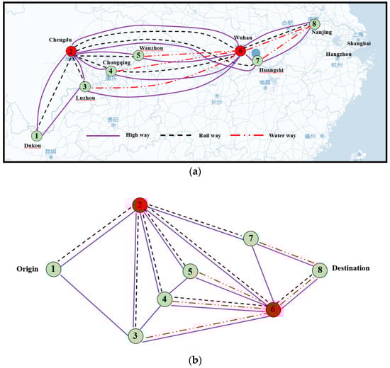 Transport network diagram. (a) Transport network of case and (b) transportation network topology.