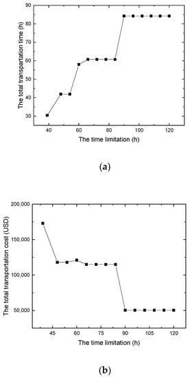 Objectives of transportation time and transportation cost under different time limits. (a) The relationship between time limitation and the total transportation time and (b) the relationship between time limitation and the total transportation cost.