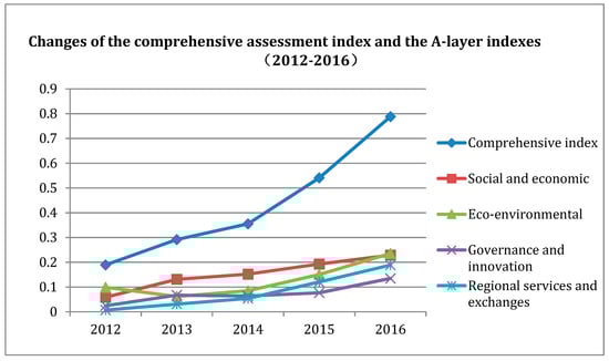 Changes of the comprehensive assessment index and the A-layer indexes (2012–2016) Notes: The data are from the results of the indexes evaluation.