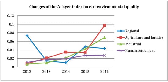 Changes of the A-layer index on eco-environmental quality (2012–2016) Notes: The data are from the results of the indexes evaluation.