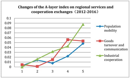 Changes of the A-layer index on regional services and cooperation exchanges (2012–2016) Notes: The data are from the results of the indexes evaluation.