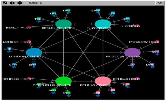 Before running the simulation, the user sets: the number of centers (6), the number of active airports for each center (3), the number of airplanes per center (500), the processing capacity of the control centers, the storage capacity of the holding centers, the maximum time of delay, the time to departure, and the flight time. The simulation runs endlessly, until the user triggers one of the in-built scenarios of the model. The tests have limited durations and then the system returns to normal. There are no permanent systemic changes, especially to allow for comparisons between normal and crisis events. The system process is as follows. A new actor is generated at a given moment at a random airport, as long as there is still capacity in the system. It sets a departure time and a destination airport. When the time reaches zero, the actor queries the control center affiliated to its airport to see if it may lift off. If it may not, the plane stays at its initial airport in a holding area, awaiting its opportunity to continue on its way. The system tracks these delays. After it departs and arrives at its destination according to a variable formula, it queries the control center to see if it can coordinate its journey’s end phase. If it cannot, it is stored in a holding area until there is sufficient system capacity to allow it through. Otherwise, if the plane exceeds its maximum waiting time, it drops out of the system and is considered to have been rerouted to another airport outside of the system because of fuel issues or malfunctions. If it passes through the control center, then the plane is reset and the process starts all over again from the beginning. The system is heavily abstracted, but offers a baseline to compare with the effects of the preprogrammed disruptions. [
