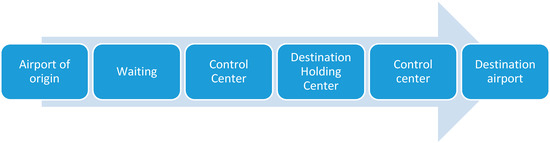 40]. In ABM, a system is modeled as a collection of autonomous decision-making entities called agents. Each agent individually assesses its situation and makes decisions on the basis of a set of rules. Agents may execute various behaviors that are appropriate for the system they represent; in our case, the simulated agents are the airplane, the airports, the holding centers, and the control centers [
