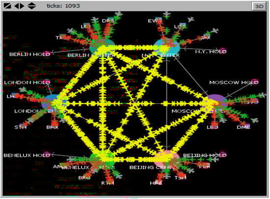 The system subject to modeling embeds numerous variables which can be tweaked by the user. The operating process is as follows: an agent is generated at a random airport, with a random destination and time of departure. If the control center has insufficient processing capacity, it is delayed. If it can be processed, it moves on at its given speed towards the destination holding center, where the destination control center is queried for capacity. If there is enough capacity, the agent moves to the destination airport and is removed from the system. If not, it may wait in the holding center. Waiting for too long (a system variable) leads to the airplane dropping out of the system by choosing a non-listed airport to resupply.