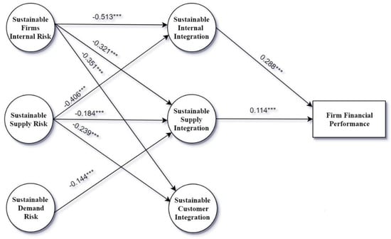 In this section, we have explained the details about constructs used in this study, such as sustainable supply chain risk, sustainable supply chain integration, and firm’s financial performance. Three risk variables based on the risk classification of Christopher and Peck [47] are used in this study, which are the firm’s internal risks, sustainable supply risks, and sustainable demand risks. SCR variables are taken after careful examination of the prior literature [76,77], which was turned into questions to identify their impact on SSCI and firm’s financial performance. All the constructs are explained in Table 2.