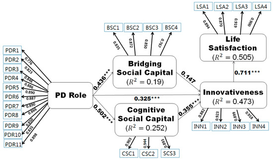 We developed a questionnaire after conducting an extensive literature review and considering the uniqueness of Tour Dure. There are 39 PDs in total. The PDs’ roles have not previously been fully investigated. As a result, we interviewed 4 PDs in order to identify their roles in the Tour Dure communities. For developing the PD role, we referred to results of interviews with PDs and Kim and Kim’s [] study and modified for the purpose of this study. Kim and Kim [] identified the roles of Tour Dure PDs and their challenges in facilitating the projects in local regions. Social capital was classified into two dimensions: bridging and cognitive social capital, adapting measurements from Nahapiet and Ghoshal [] and Williams []. Innovativeness consists of four items adapted from Agarwal and Prasad [] and Tan and Sie []. Five items were used to measure individual life satisfaction, using questions adapted from Fornell et al. [] and modified for our study. Table 3 shows the measurement items for the questionnaire.