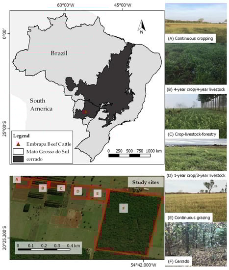 We developed this investigation in the experimental site of the Embrapa, located in Campo Grande, Mato Grosso do Sul (Figure 1). The Embrapa has been maintaining a long-term experiment in which crop–livestock integrated systems have been studied for 26 years. The experiment was initially designed to compare agronomic and economic efficiencies of different management systems [21]. Currently, the focus has been on the sustainability of these agricultural land uses to contribute to global food security.