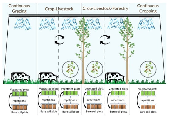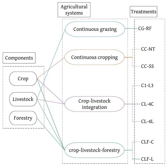 Diagram of the 4 agricultural systems and their respective treatments. Continuous grazing under variable stocking rate with regular fertilization (CG-RF); continuous cropping under no-tillage without subsoiling (CC-NT) and with four-year subsoiling (CC-SS); a rotation of one year cropping and three years livestock (C1-L3); a rotation of four years cropping and four years livestock in the cropping phase (CL-4C) and in the livestock phase (CL-4L); and integrated crop–livestock–forestry in the cropping phase (CLF-C) and in the livestock phase (CLF-L).