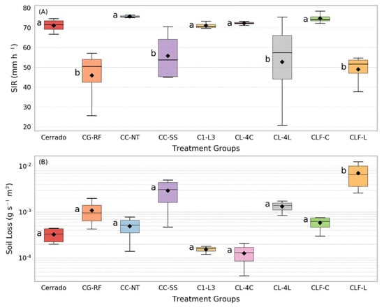 Box plot of stable infiltration rate (SIR) and soil loss (SL), respectively, in (A,B), for each studied treatment. It is shown in the 25th and 75th percentiles, the median with a line, the mean with a rhombus, whiskers indicate the maximum and minimum values. Different letters indicate statistical different groups (α = 0.05). CG-RF is continuous grazing under variable stocking rate with regular fertilization; CC-NT is continuous cropping under no-tillage without subsoiling; CC-SS is continuous cropping under no-tillage with four-year subsoiling; C1-L3 is a rotation of one year cropping and three years livestock in the livestock phase; CL-4C is a rotation of four years cropping and four years livestock in the cropping phase; CL-4L is a rotation of four years cropping and four years livestock in the livestock phase; CLF-C is an integration of crop-livestock-forestry in the cropping phase; CLF-L is an integration of crop-livestock-forestry in the livestock phase.