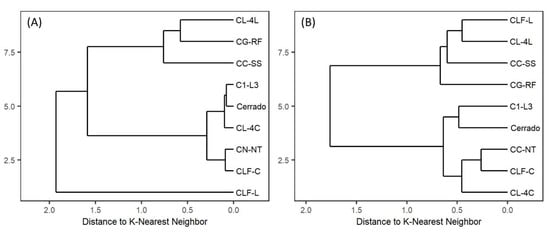 In terms of SIR considering all treatments under vegetation cover, we observed the best results in CC-NT, C1-L3, CL-4C, and CLF-C; those treatments were similar to the native Cerrado vegetation. On the other hand, SIR in the CG-RF, CC-SS, CL-4L, and CLF-L was lower than that found at the Cerrado vegetation (Table 3). Moreover, soil loss in all the treatments was similar, except for the CLF-L, where we found the highest soil loss values. The levels of similarity are represented using a dendrogram based on cluster analysis and the k-nearest neighbor (Figure 5A). We observed similarity among CC-NT, C1-L3, CL-4C, CLF-C, and the Cerrado as well as among CG-RF, CC-SS, and CL-4L. We also noted the highest dissimilarity of CLF-L regarding the other treatments.