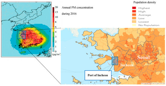 Geographical visualized emission and population density of Port of Incheon area. Source: [48] and ArcGIS Online.