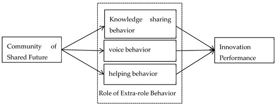 This paper investigates the relationship between the community of shared future, extra-role behavior, and innovation performance. This paper conducts an empirical study based on 334 valid sample data items of 53 technology-based small to medium enterprises (SMEs) in China. The data were subjected to structural equation analysis using SPSS 20.0 software. The results show that the community of shared future positively affects the extra-role behavior of employees and their innovation performance and has a positive impact on knowledge sharing behavior, voice behavior, and helping behavior. Knowledge sharing behavior, voice behavior, and helping behavior all play a mediating role between the community of shared future and employees’ innovation performance.