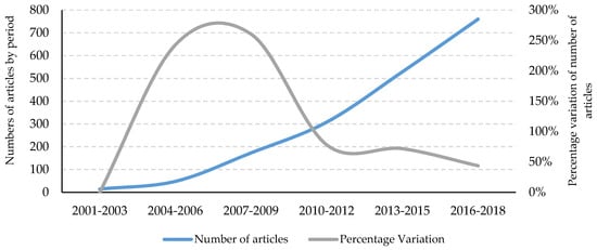 Table 2 shows the evolution of the main features of the articles published on CSR’s sustainable approach from 2001 to 2018. In this period, the interest in researching the CSR-sustainability relationship has increased, especially in the last six years, as seen in the variables analyzed. If only 14 articles on this subject were published in 2001–2003, in the last three years analyzed (2015–2018) the number amounted to 760, or almost 55 times more. The increase in the number of publications is particularly accentuated in the latter three years, where 41.5% of the total articles published in the period analyzed have been published. The year in which most publications have been produced is 2018, with 304 articles.
