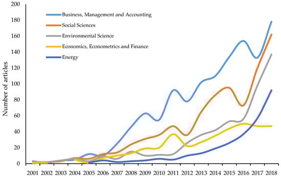 Figure 2 presents how the thematic classification of articles on CSR and sustainability has evolved in the period of 2001–2018. The Business, Management, and Accounting category is the most prominent throughout the period studied. In this category, 31% of published articles were based on CSR and sustainability. It is then followed by the Social Sciences category, with 21%. Other categories included Environmental Science (14%), Economics, Econometrics and Finance (10%) and Energy (7%) are the following categories in order of importance. Thus, the five most important categories represented in Figure 2, represent 83% of the documents published in this field of research from 2001–2018. Except for Engineering (5.1%) and Arts and Humanities (4%) categories, the rest of the subject areas did not reach 2% of published works.