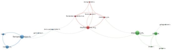 Figure 3 shows the collaboration map among the leading authors who have published on the sustainable dimension of CSR, based on co-authorship. The different colors represent the different clusters formed by the working groups in the production of articles. The size of the circle varies depending on the number of articles of each author. The main authors are grouped into three clusters. Cluster 1 (red) stands for the collaboration between Muñoz-Torres and Rivera-Lirio, Fernández-Izquierdo, Ferrero-Ferrero, and Escrig-Olmedo. Group 2 (green) is led by Moneva, University of Zaragoza, along with Ortas, Alvarez, Gallego-Alvarez, and Garallar. Finally, the third cluster (blue) is led by Fernández-Feijoo, from the University of Vigo, which collaborates with Ruíz, Romero, García-Torea and De la Cuesta-González.