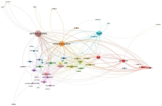 Figure 4 shows a collaboration map between major countries based on the co-authorship of their authors. The different colors represent the different clusters formed by the groups of countries and the size of the circle varies depending on the number of items in each country. Thus, the greater the circle of each country, the greater the number of items whose authorship it represents. Countries with more than five contributions have been grouped into eight clusters.