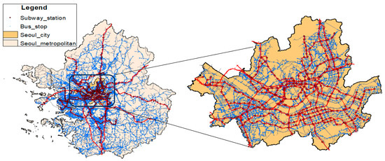 Currently, Seoul alone is supported a large public transportation network consisting of nine subway lines, which cover a total service distance of 331.6 km, and an efficient bus system which comprises 8090 bus stations with bus stops spread across the study area [60]. The bus and subway systems complement each other and public transportation riders have the chance to transfer between modes while they enjoy discounted fares when they use the T-money card, which is a transit smart card developed by the Korea Smart Card Co., Ltd. [16]. The smart card has continued to be the primary payment method employed by the public transportation system. It allows for riders to tap their card upon entering the bus, taxi, or subway station and once more upon alighting or exiting the station. The managers of the transport system can collect the data, which contain the trajectories (origin to destination) of the individual riders. The provision of seamless transfers between the same or different modes, together with transfer discounts, made public transportation more attractive and induced higher ridership. The GIS-based map in Figure 1 below shows the complete distribution of nodes (stations and bus stops) in SMA and Seoul.