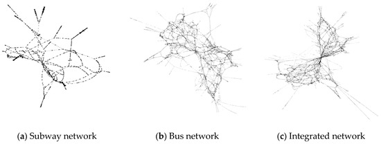 Graphs of subway, bus, and the integrated bus and subway networks. (a) Subway network; (b) Bus network; (c) Integrated network.