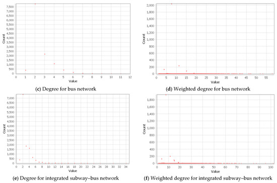 Degree and weighted degree distributions of the subway, bus, and integrated networks. (a) Degree for subway network; (b) Weighted degree for subway network; (c) Degree for bus network; (d) Weighted degree for bus network; (e) Degree for integrated subway–bus network; (f) Weighted degree for integrated subway–bus network.